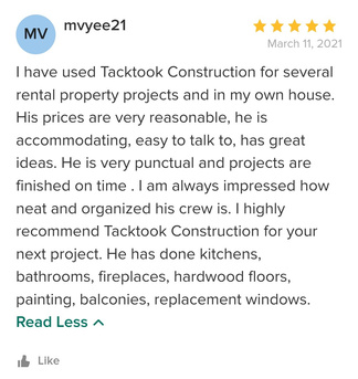 Tacktook Construction provides the following services: Accessory Dwelling Units (ADUs), Baseboard Installation, Basement Remodeling, Bathroom Remodeling, Countertop Installation, Custom Home, Custom Home Bars, Deck Building, Drywall Installation, Electric, Exterior Door Installation, Garage Building,Guesthouse Design & Construction, Hardwood Flooring, Home Additions, Home Extensions, Home Remodeling, Home Restoration, Kitchen Remodeling, Kitchen Cabinets,Lighting, New Home Construction, Outdoor Kitchen Construction, Painting Interior And Exterior, Plumbing, Project Management, Range Hood Installation, Shower Installation, Siding Installation, Siding Repair, Stair Installation, Staircase Design, Tile Cutting, Tile Installation, Vinyl Flooring Installation, Vinyl Siding, Window Installation, Window Replacement, Wood Floor Installation, Wood Siding